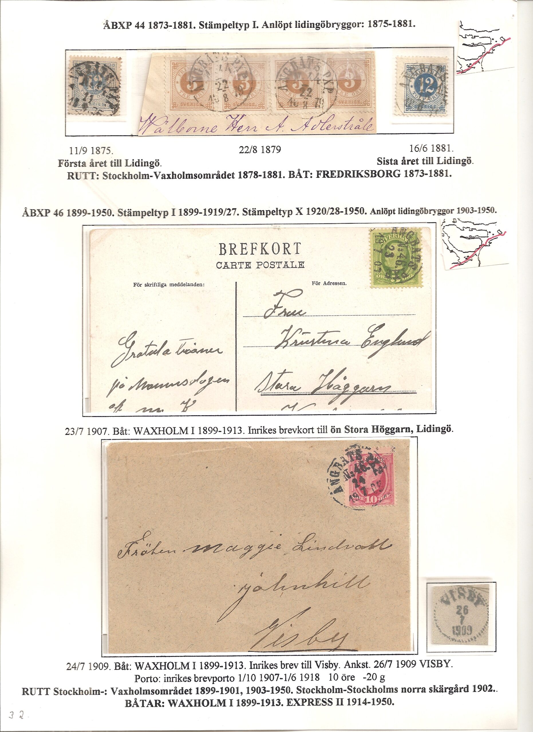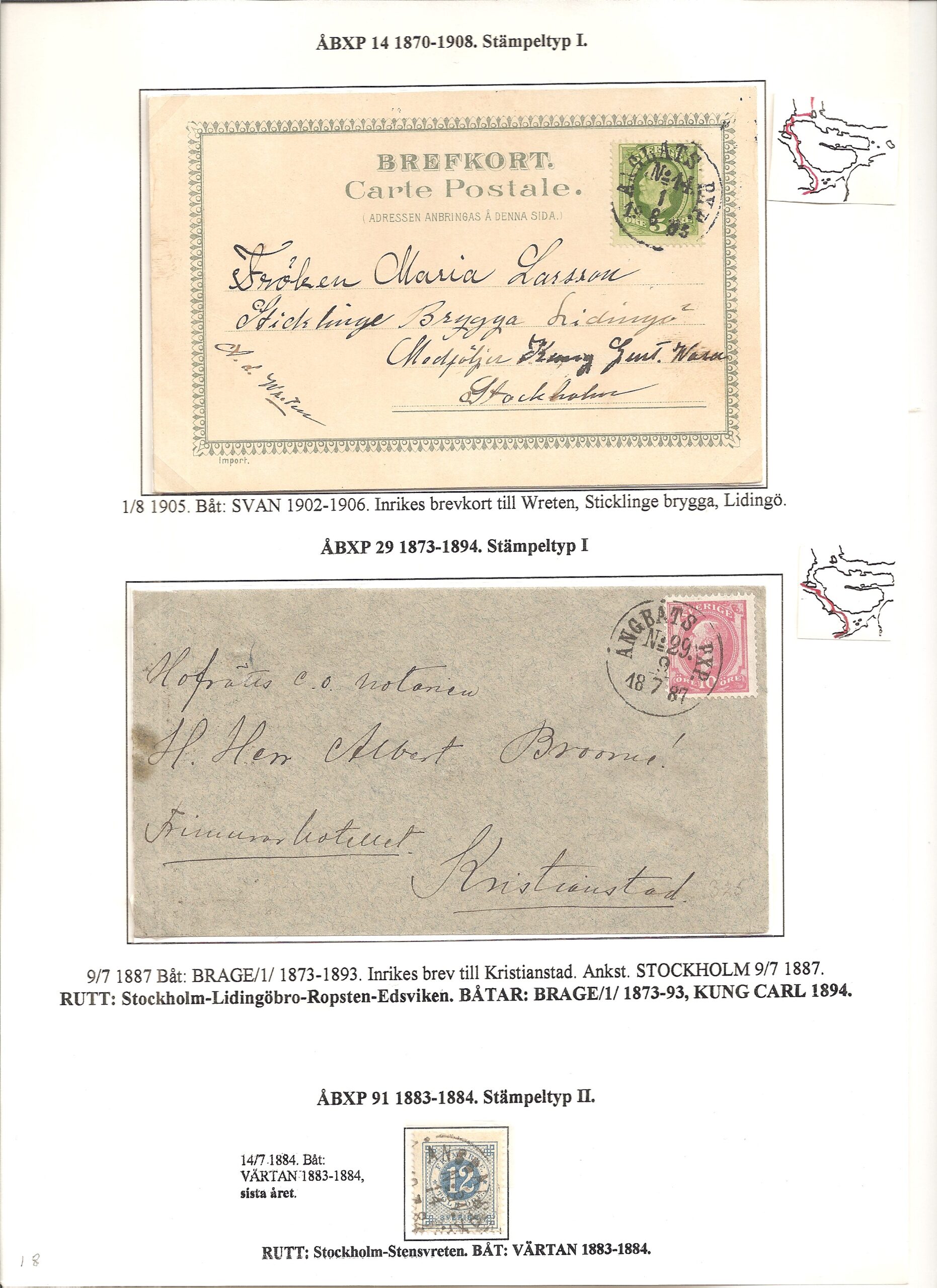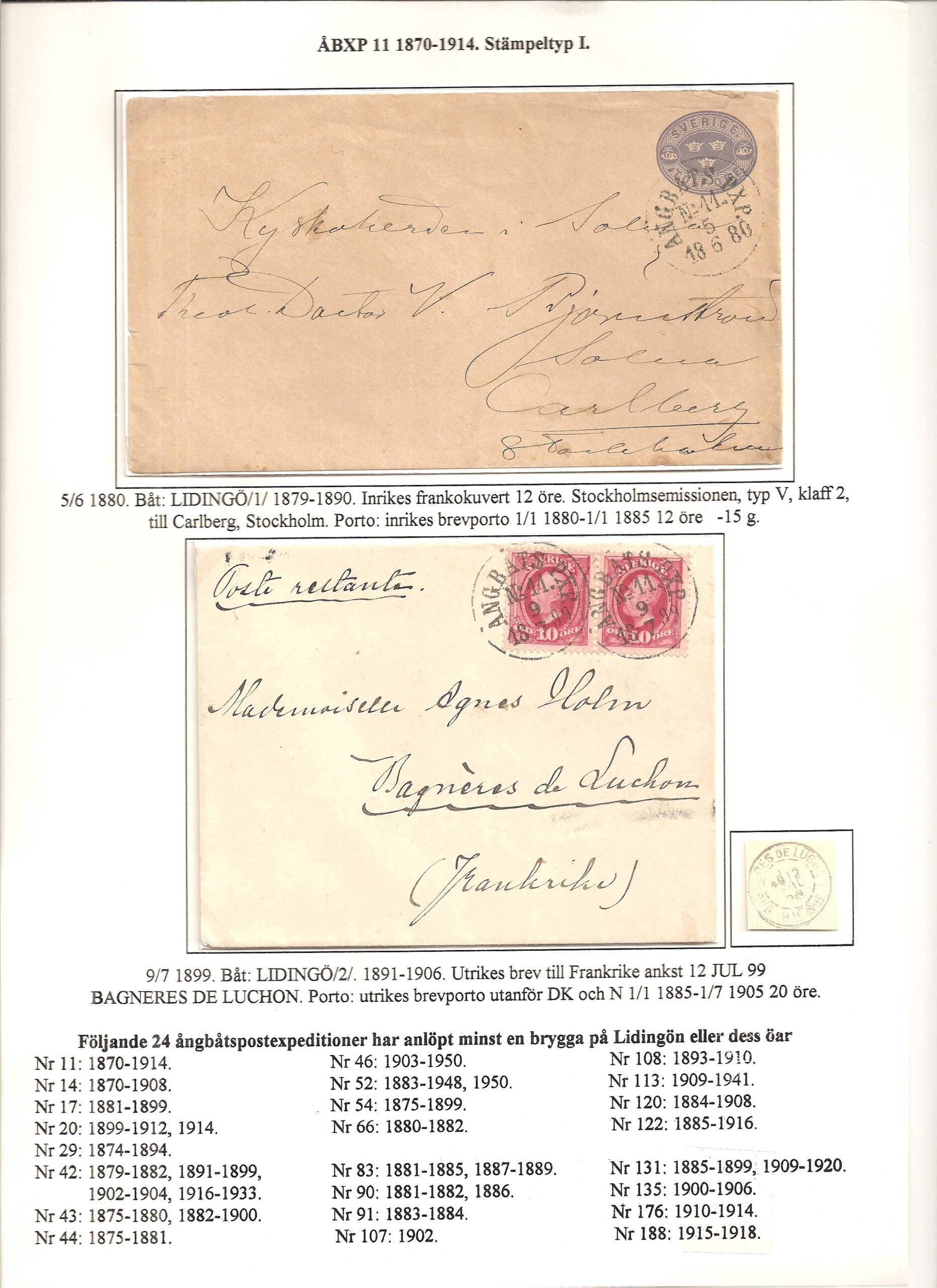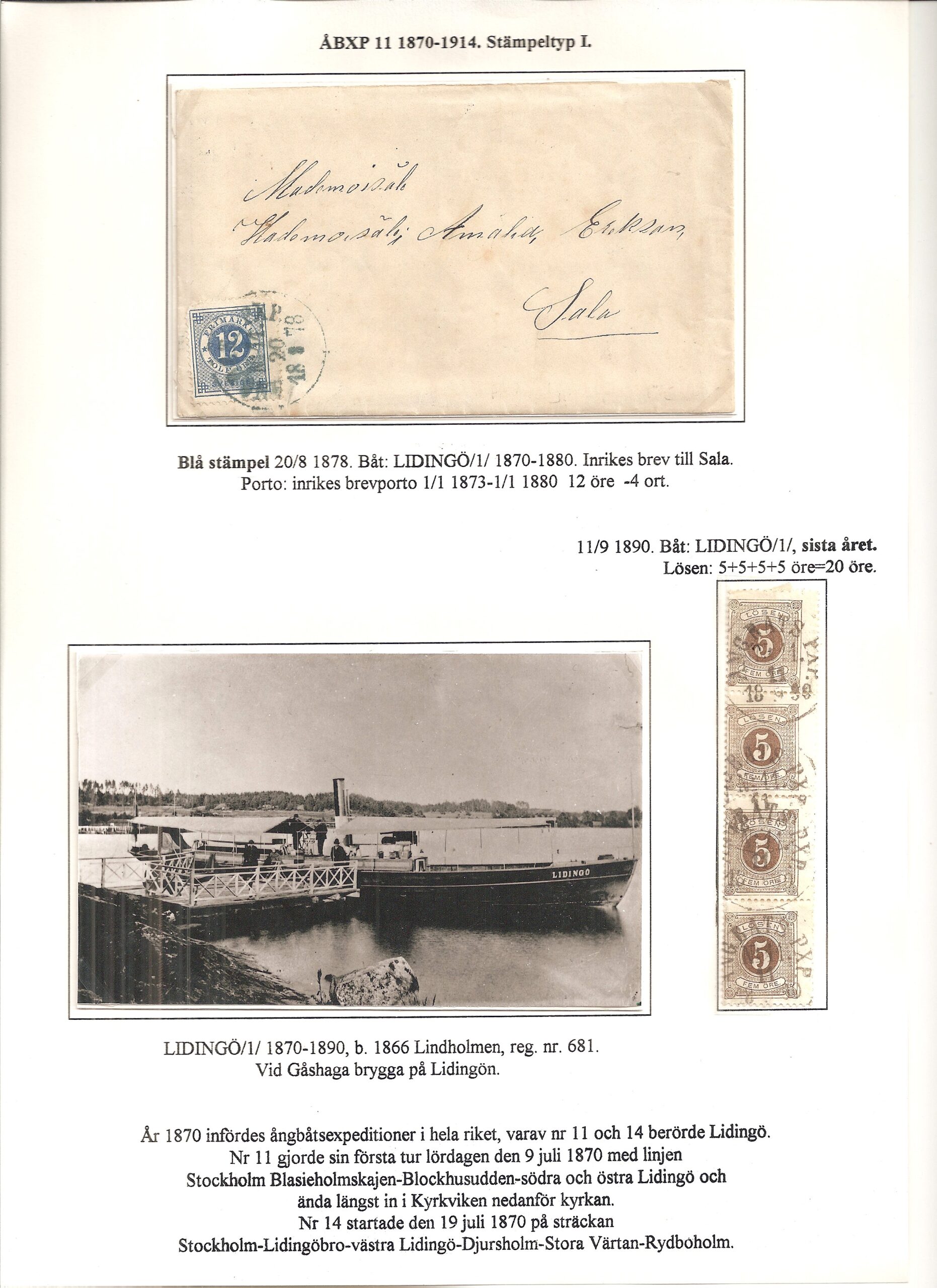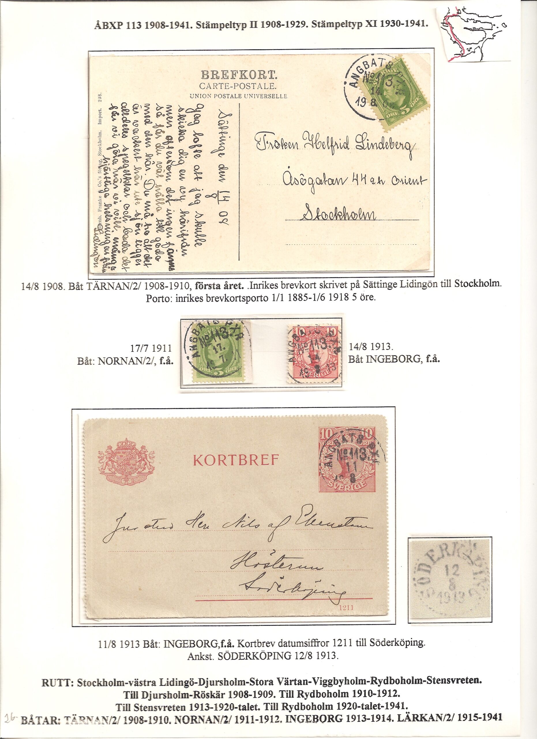 Samlingen Ångbåtspost till Lidingö skapades av Tofte Norén (1928 – 2017). En speciell stämpel är den blåa ÅBXP 11.